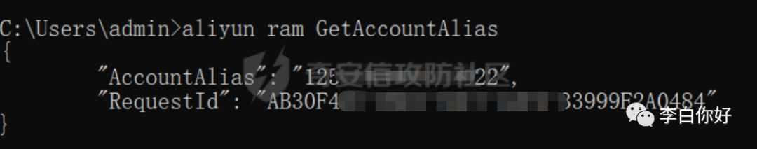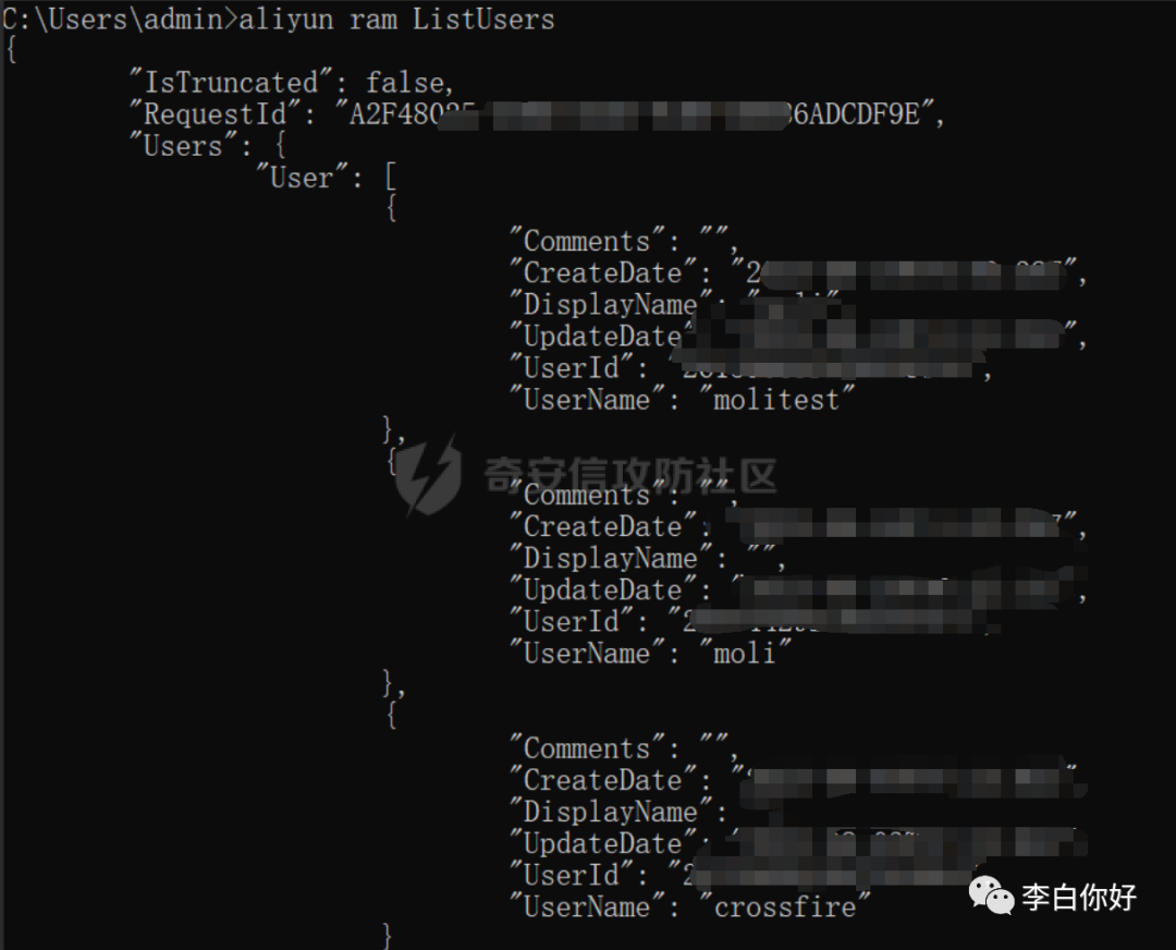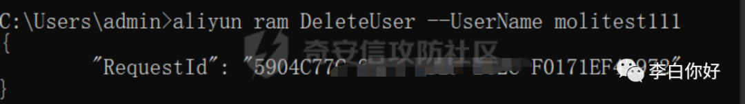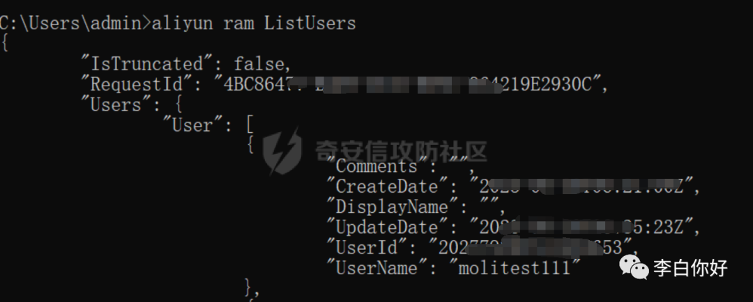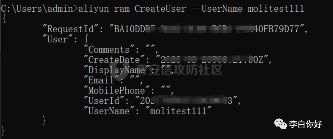 接下来创建账号,输入aliyun ram CreateUser --UserName molitest111