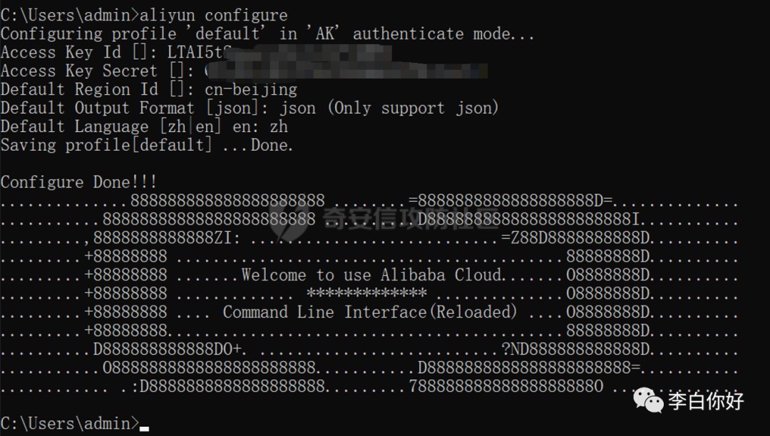 出现下面这一坨welcome to use alibaba cloud就是配置成功了,上文已经讲了创建用户的流程,接下来就是用命令行操作一遍