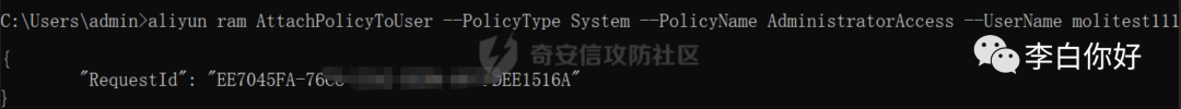 aliyun ram AttachPolicyToUser --PolicyType System --PolicyName AdministratorAccess --UserName molitest111