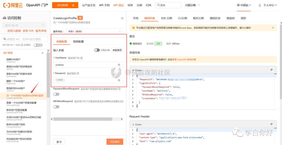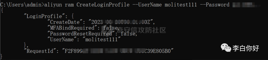 aliyun ram CreateLoginProfile --UserName molitest111 --Password Poker安全