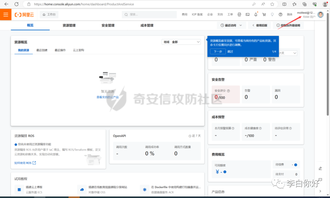 为什么呢?因为我的账号这里,其实我是有云上资源的,但是没有给这个molitest用户赋权,所以他看不到任何东西,账号资源如图