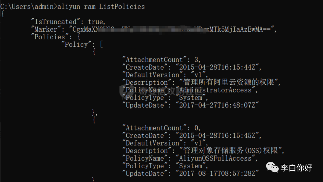 他的PolicyType是System,PolicyName是AdministratorAccess,这个是阿里云默认的,也就是管理所有阿里云资源的权限,其实和cf工具的命令一样,直接接管控制台的命令也是通过这些去调用的,不过云厂商现在研究了cf的特征,导致一用cf调用ak/sk就会产生告警
