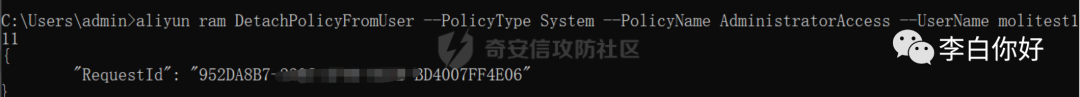 aliyun ram DetachPolicyFromUser --PolicyType System --PolicyName AdministratorAccess --UserName molitest111
