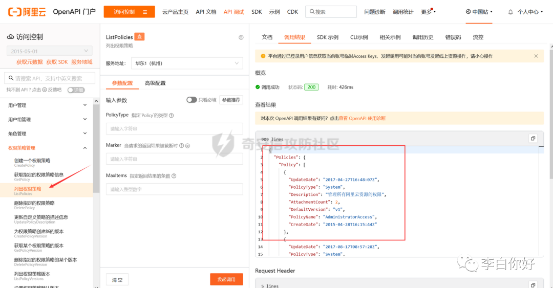 添加好之后,接下来调用ListPolicies接口 列出权限策略 给刚才创建的用户加上权限