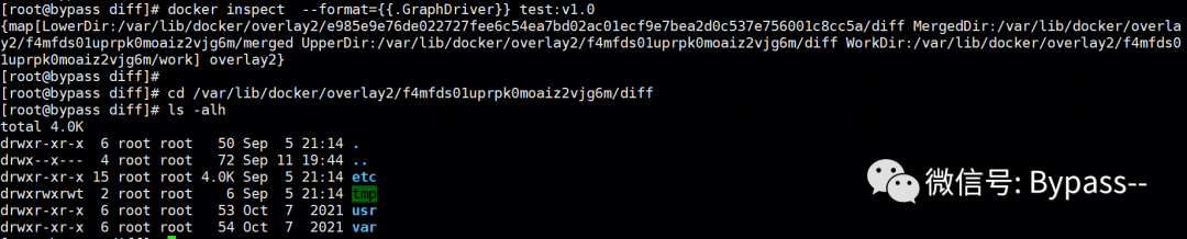 docker inspect --format={{.GraphDriver}} test:v1.0cd /var/lib/docker/overlay2/f4mfds01uprpk0moaiz2vjg6m/diff
