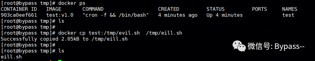 docker run -d --name test test:v1.0 //运行容器docker cp test:/tmp/evil.sh /tmp/eill.shdocker rm test //删除容器