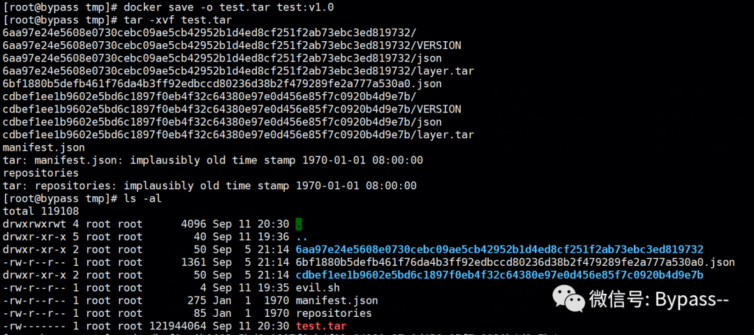 docker save -o test.tar test:v1.0tar -xvf test.tartar -xvf cdbef1ee1b9602e5bd6c1897f0eb4f32c64380e97e0d456e85f7c0920b4d9e7b/layer.tareill.sh