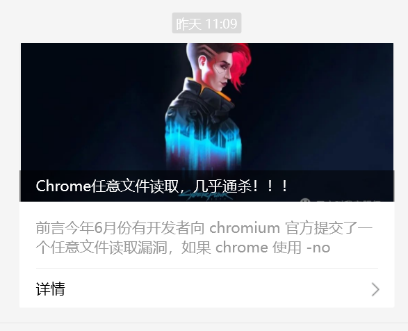 今年6月份有开发者向 chromium 官方提交了一个任意文件读取漏洞,如果 chrome 使用 -no-sandbox 启动,则可以读取本机任意文件,如果是默认沙箱环境,攻击者可以在 ios (safari/chrome)、mac (safari/chrome)、android (chrome) 和 samsung tv(默认浏览器)上读取 /etc/hosts、/etc/passwd 文件