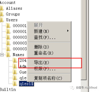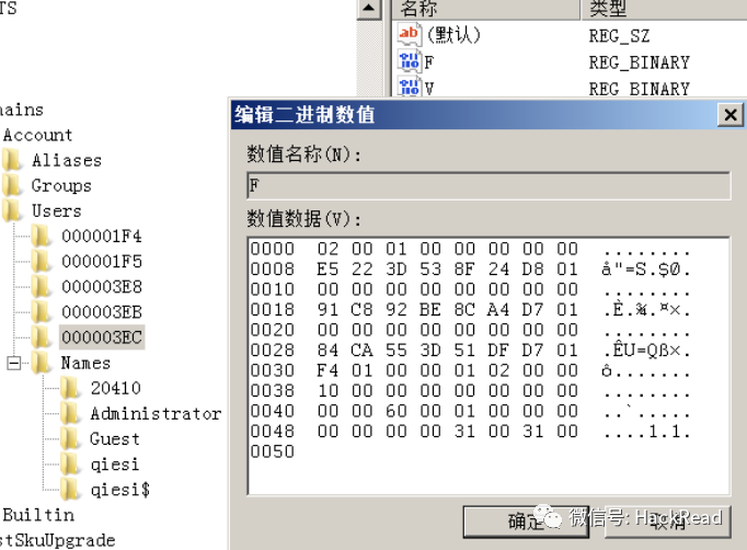 第二步:打开注册表HEKY_LOCAL_MACHINE\SAM\SAM\Domains\Account\User。将管理员对应的F项的值,复制粘贴到qiesi$用户的对应F项的值。