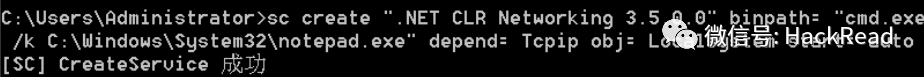 sc create ".NET CLR Networking 3.5.0.0" binpath= "cmd.exe /k C:\Windows\System32\notepad.exe" depend= Tcpip obj= Localsystem start= auto