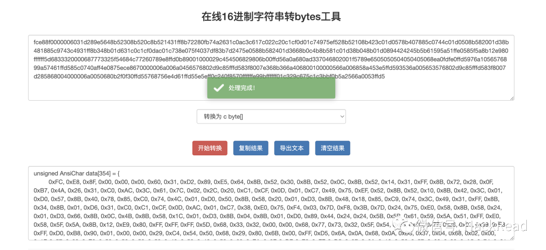 利用工具网站(http://gv99.com/text/hex2bytes.html) 转为字节数组