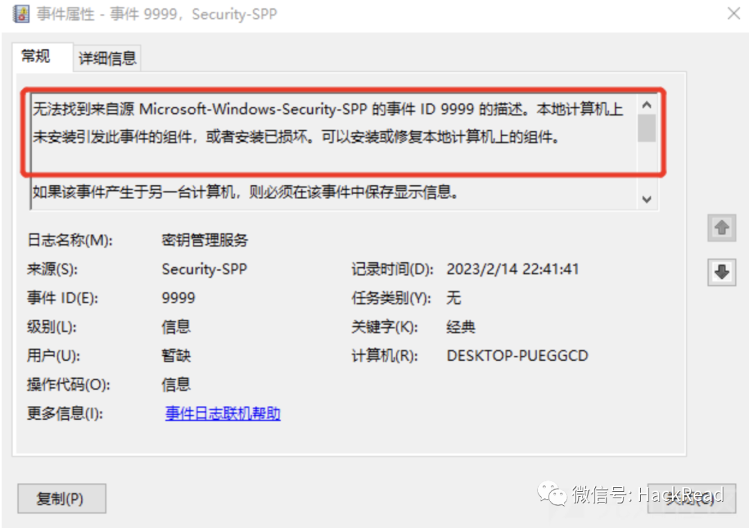 在HKEY_LOCAL_MACHINE\SYSTEM\CurrentControlSet\Services\EventLog\对应的日志名称下的条目中,存在一个EventMessageFile属性。如果在注入载荷的时候,事件ID不存在于该属性指定的源关联的事件消息文件中,则会出现下图这个日志消息: