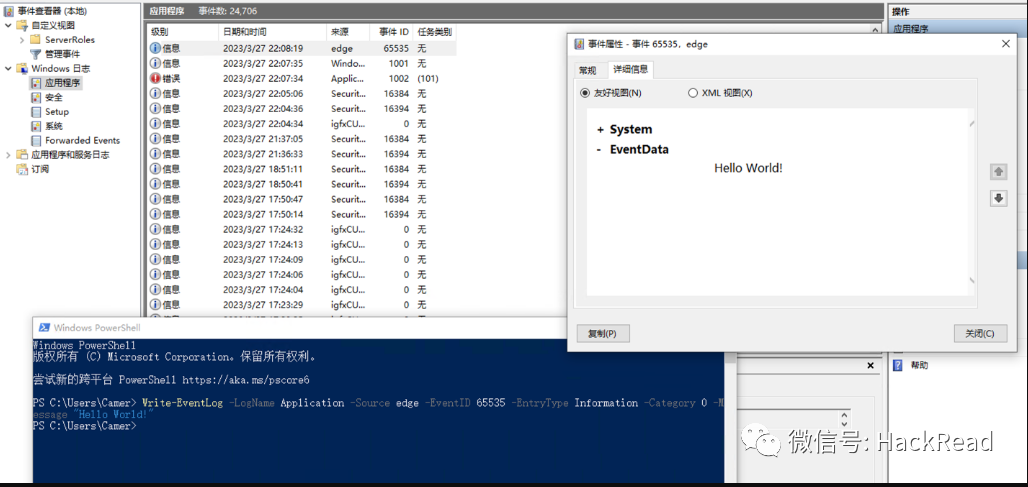 在事件查看器中,可以看到事件ID为65535的日志成功创建在应用程序日志中,消息为Hello World!