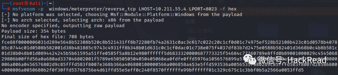 1、首先,使用msfvenom生成弹计算器 payload。输出格式为十六进制字符串