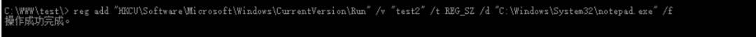 reg add "HKCU\Software\Microsoft\Windows\CurrentVersion\Run" /v "test2" /t REG_SZ /d "C:\Windows\System32\notepad.exe" /f