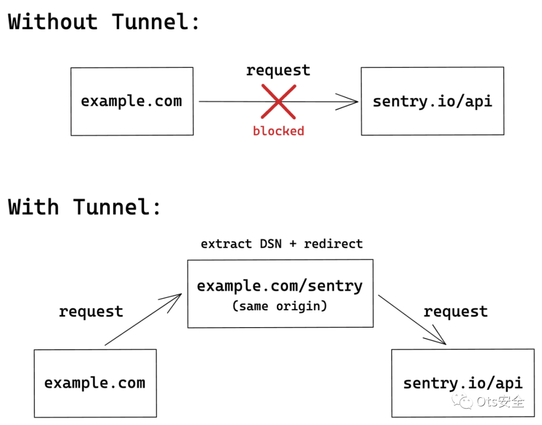 如果没有隧道,发送到 Sentry 的请求将直接通过前端的浏览器发送。但是,这些直接发送到 Sentry 的请求可能会被广告拦截器拦截,从而导致 Sentry 无法接收数据。如果启用了隧道,请求首先发送到用户自己的服务器,然后转发到Sentry。这样,该请求就成为同源请求,不会被广告拦截器拦截。