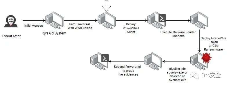 图 1:描述威胁行为者利用 CVE-2023-47246 漏洞渗透 SysAid 系统的攻击链
