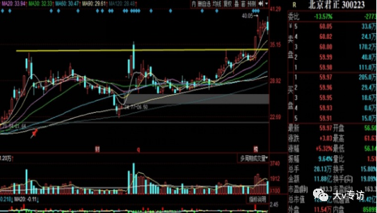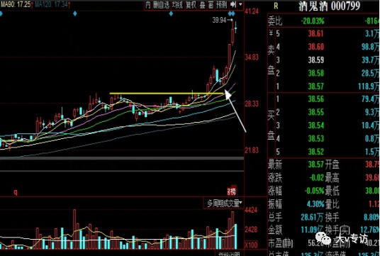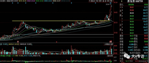 大部分上行趋势中的回踩没有示意图中这么标准,毕竟市场不是数学题。回踩时间、幅度需要结合题材热度、板块走势等多方面影响。但回踩缩量基本不变。酒鬼酒突破原压力线后,有回踩动作,但回调没到支撑位就转身上拉。