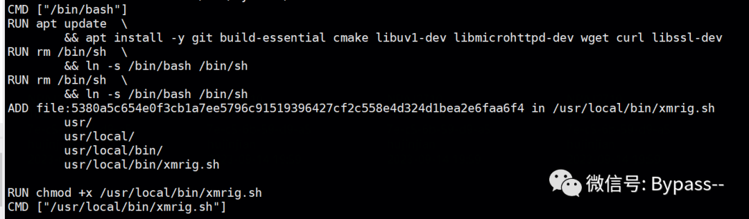 (2)使用dfimage从镜像中提取 Dockerfile,在这里可以清晰地看到恶意镜像构建的过程,找到恶意挖矿程序的样本。