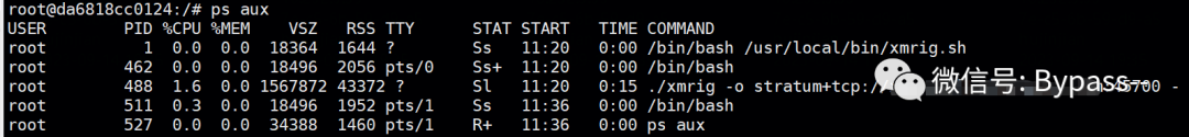 (1)进入容器,找到挖矿程序的进程,恶意脚本路径为xmrig.sh。