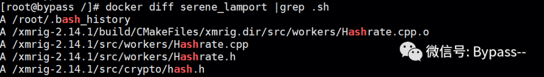 使用docker diff命令查看容器内文件状态变化,未找到xmrig.sh。
