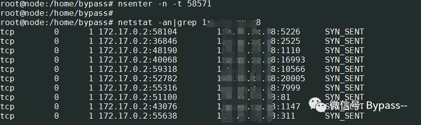 #获取容器PIDdocker inspect -f '{{.State.Pid}}' <containerId>#进入容器的network namespacensenter -n -t pid # 验证是否进入容器的network namespacenetstat -an|grep xx.xx.xx.xx