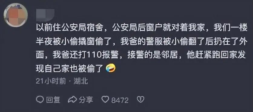 更夸张的就是,这位网友把自己的亲身遭遇给说了出来:“以前住公安局宿舍,公安局后窗户就对着我家,我们一楼半夜被小偷撬窗偷了,我爸的警服被小偷翻了后扔在了外面,我爸还打110报警,接警的是邻居,他赶紧跑回家发现自己家也被偷了。”