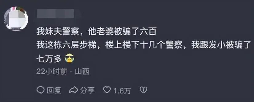 有网友无语地说道:“我妹夫是警察,他老婆被骗了六百,我这栋六层步梯,楼上楼下十几个警察,我跟发小被骗了七万多。”