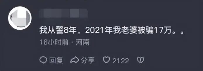比如有一位自称从警8年的网友评论道:“2021年我老婆被骗17万。”