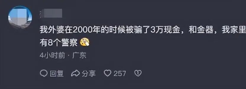 还有网友说道:“我外婆在2000年的时候被骗了3万现金,和金器,我家里有8个警察。”