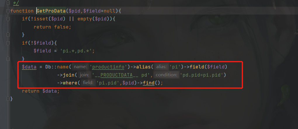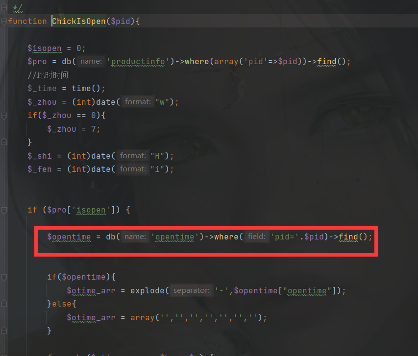 SELECT `pi`.*,`pd`.* FROM `wp_productinfo` `pi` INNER JOIN `wp_productdata` `pd` ON `pd`.`pid`=`pi`.`pid` WHERE `pi`.`pid` = '23' LIMIT 1而真正存在漏洞的其实是在下图的ChickIsOpen()