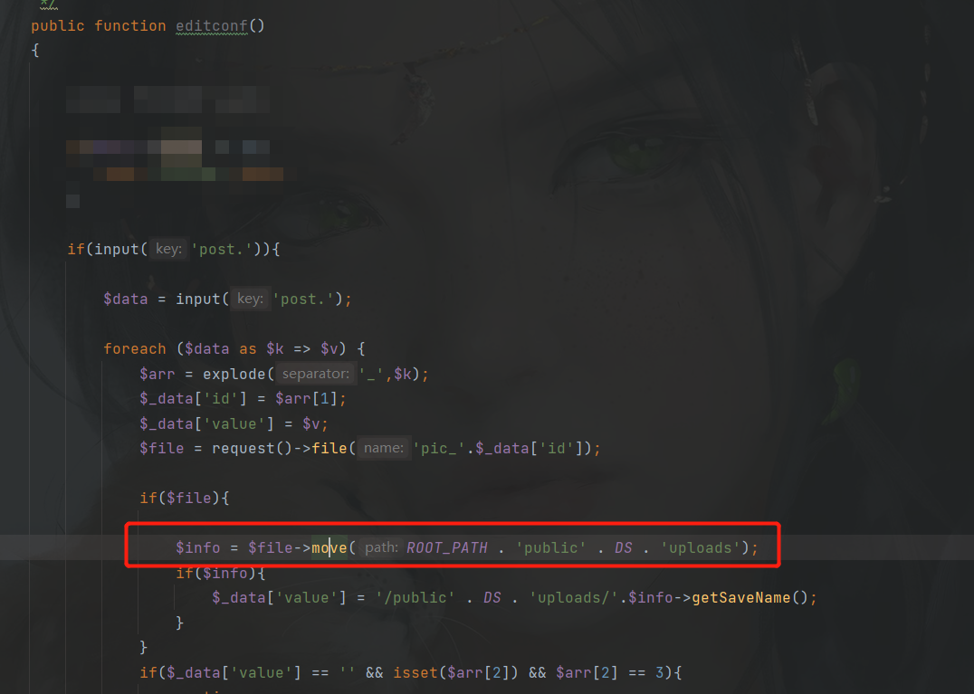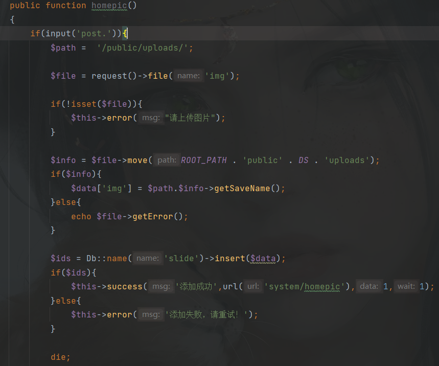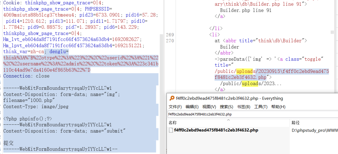 不过由于这个地方在move下一行会$info->getSaveName();返回文件路径。并保存到数据库中。我们可以在前端就能看到。所以这里就不用爆破文件名去找文件了(实际上这个随机数也是可以爆破的,这里就无需多讲。后面有缘分我教大家怎么爆破。或者自行摸索一下)