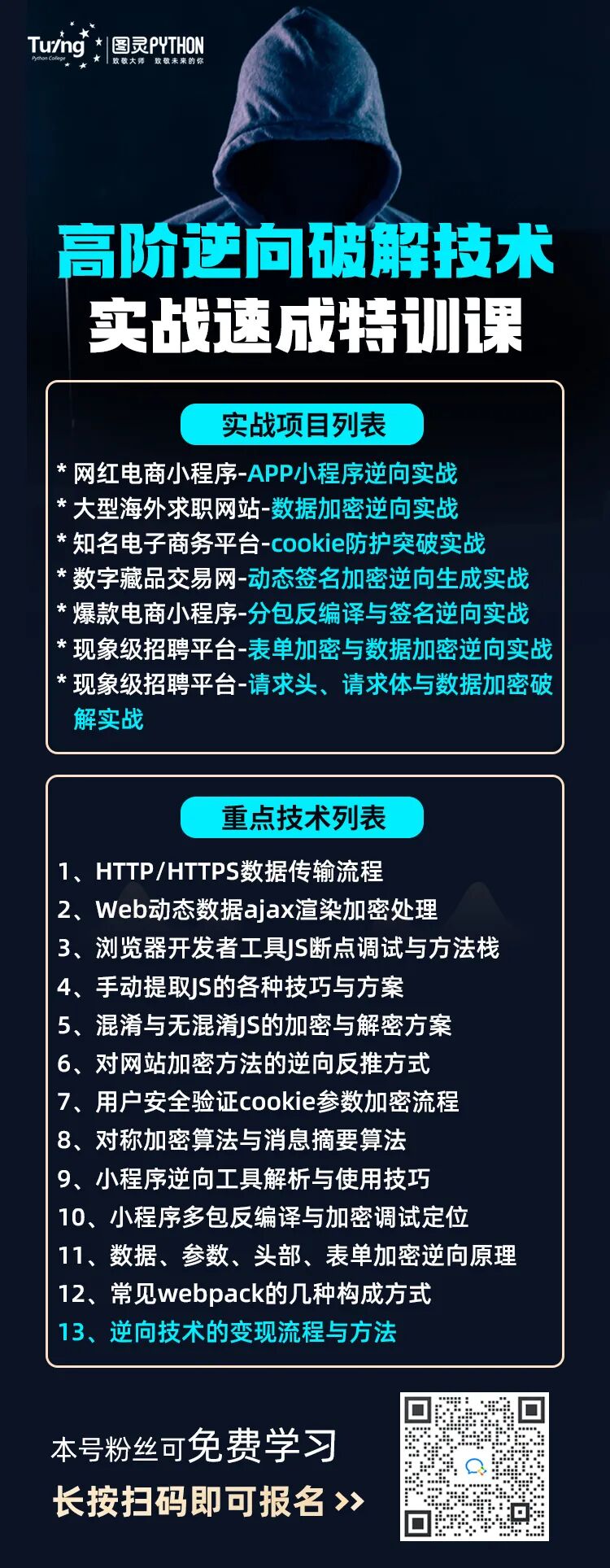 想要快速学好爬虫,尤其是可以用于变现的高阶爬虫技术,野路子的啃书自学就大可不必了,我建议直接来听一堂高阶逆向破解技术的速成课程