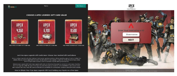 在下面的屏幕截图中,可以看到此骗局的典型示例。网络犯罪分子向用户提供“免费的Apex Legends礼品卡”,要获得这些奖励,首先要输入用户名,然后回答几个问题并支付奖金。
