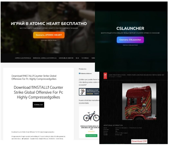 伪装成流行游戏的恶意软件和不需要的软件通常由提供盗版游戏的第三方网站分发,在下面的屏幕截图中,可以看到此类网站的示例,提供“免费”下载Atomic Heart、CS:GO和Euro Truck Simulator 。