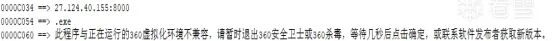 程序运行后会检测360程序,有360程序则会弹框,并退出程序执行。弹框内容如下: