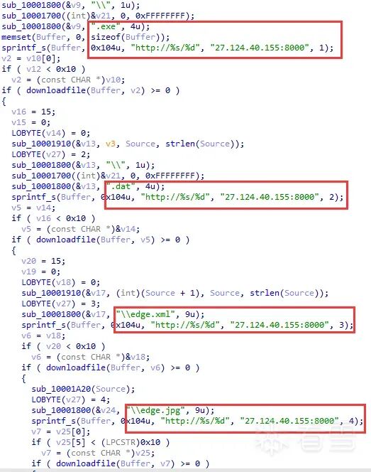 从指定的url处分别下载一个exe,一个.dat,和edge.jpg,edge.xml;其中exe和.dat使用同一个随机名称;所有文件保存到\Users\用户\AppData\Roaming目录下。最终的下载链接如下: