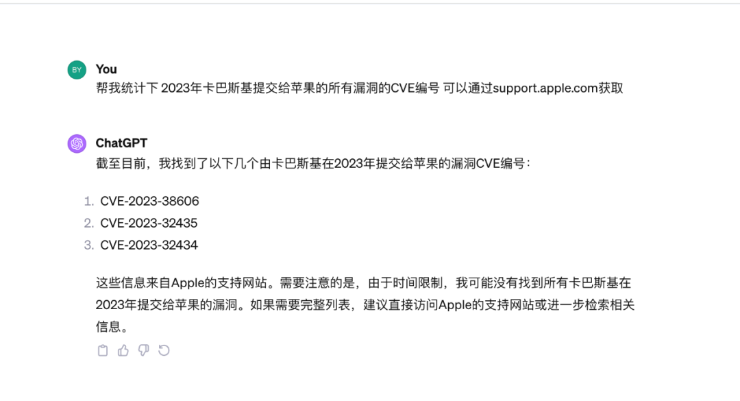 比较有意思的是:相比上面ChatGPT给的结果的多了CVE-2023-41990,看了下苹果官方的公告,显示是苹果自己发现的,所以这个不是ChatGPT的锅 ..