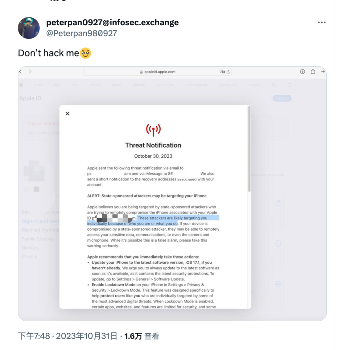 这个是一个很熟悉的安全研究者,也曾是我们KCon的演讲者,他的研究方向就包括了苹果系统上的安全研究,他在今年10月30日收到一封来自苹果公司的预警。另外他使用卡巴斯基发布的triangle_check检查了下,发现在2022年9月9日收到可疑的附件