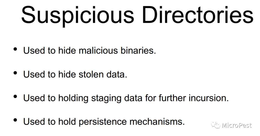 目录– 包含恶意负载、数据或工具的可疑目录,允许横向移动到网络中。
