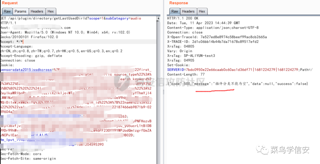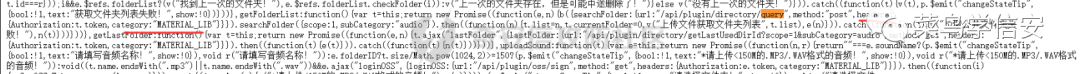 其中这里按下键盘中的F12,通过审计js后,发现接口:其中的一个接口/api/plugin/directory/getLastUsedDirId拼接后,如下提示:其中响应包中响应的“插件分类不能为空”让我百思不得其解,不知道是缺了什么参数。那么这里就再回到js中看看吧,果然,给我发现了端倪: