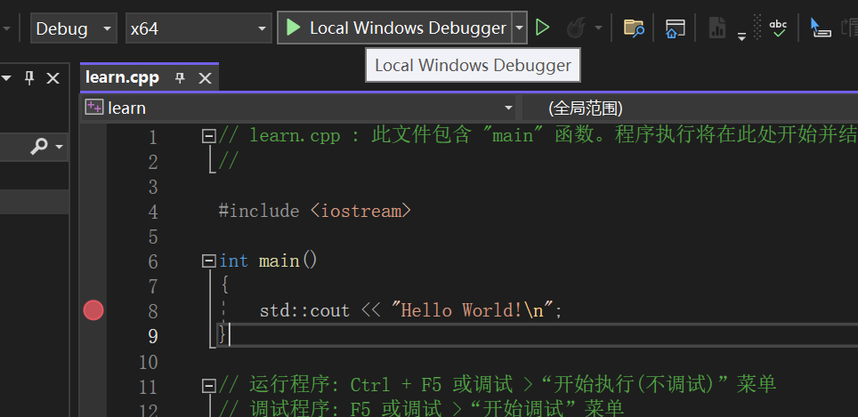 在 Debug 模式里我们可以在代码左边打断点,然后点击 Local Windows Debugger 按钮编译并使用调试器执行: