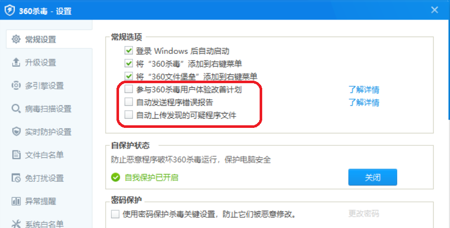 在360设置中,取消勾选“360用户体验改善计划”和“云安全计划”: