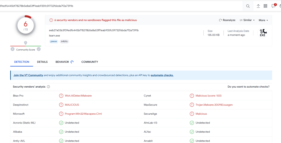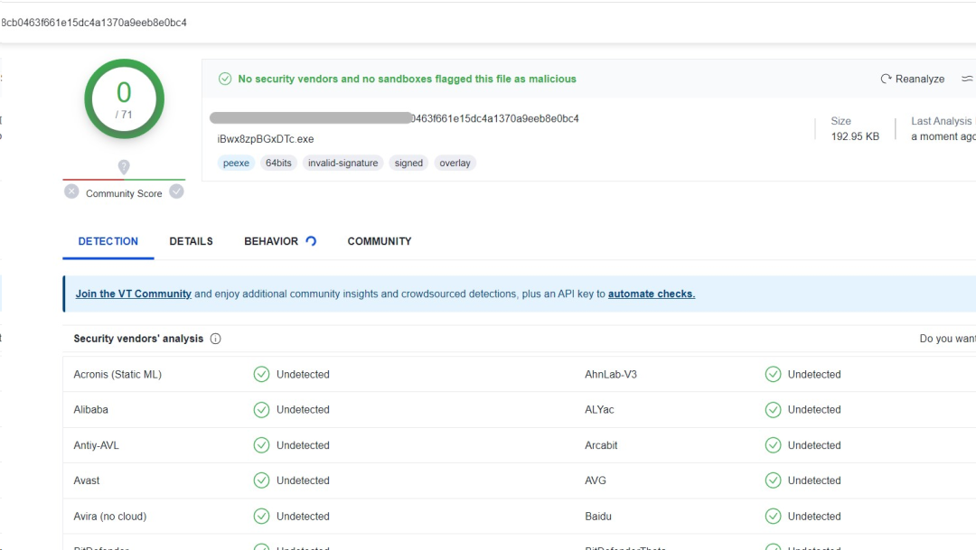 VirusTotal (https://www.virustotal.com/)是比较有名的在线杀网站,有70多个杀软环境及多个沙箱进行检测,但是上传的文件会被共享分析,被上传的免杀很快就会失效,因此不要随便将免杀上传到 VT。当然,话虽如此我还是经常上传分析,不过是本地分离、远程加载或在最后一步不能正常执行的,最好不要上传完整的免杀。
