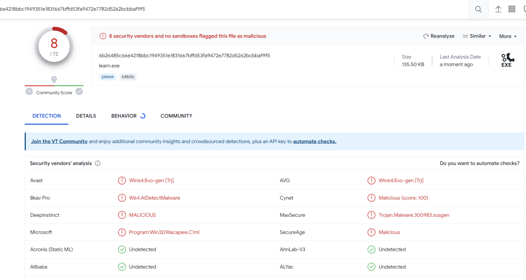 不同编译器编译后的代码不同,报毒情况也不相同,有的编译器编译的 exe 在 VT 上的报毒比较高,如 v143 编译器编译的空包 exe 通常有几十个报毒,而有的编译器编译的 exe 在 VT 上的报毒比较低,可以自己尝试一下那种编译器报毒比较低,选一个报毒低的编译器来编译。